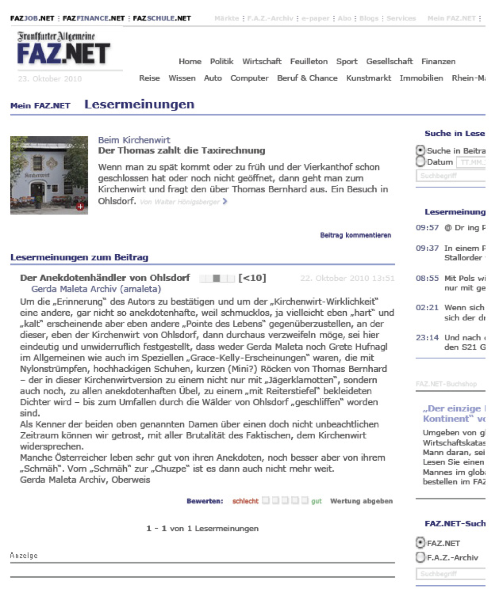 Kurz nach dem Erscheinen dieses Artikels in der FAZ unter der Rubrik «Reise» verfassten wir diese Lesermeinung, da wir die Darstellung des Kirchenwirts von Gerda Maleta wie auch Grete Hufnagl, damals fast ständige Begleiterinnen von Thomas Bernhard, so, in dieser Form, aus unserem eigenen Wissen und Beobachtungen, wirklich nicht teilen konnten.