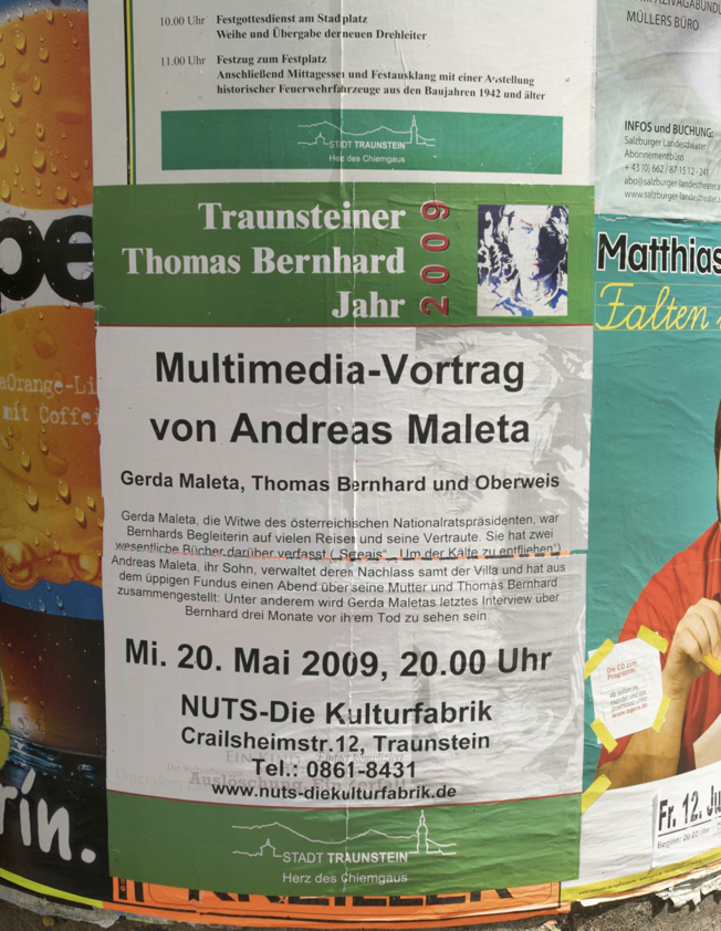 Andreas Maleta, selbst Zeitzeuge am Rande dieser Besuche und auch öfters Teilnehmer an den legendären «17 und 4» Kartenpartien, zeichnet in seinem Multimediavortrag ein sehr persönliches und humorvolles Bild von Thomas Bernhard, erweitert um die neuersten Funde aus dem umfangreichen Bernhard-Archiv von Gerda Maleta.